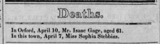 I had previously estimated that Isaac (2nd) died sometime between 1850 and 1860 based on his absence in the 1860 Census where we find Ruth still living in Orford, New Hampshire with Sumner. At the time of this blog writing, I found a newspaper article to support this which reports that Isaac Gage of Orford died on 10 April 1853. This article says he was aged 61 at death making his year of birth about 1792, matching that of our Isaac Gage.